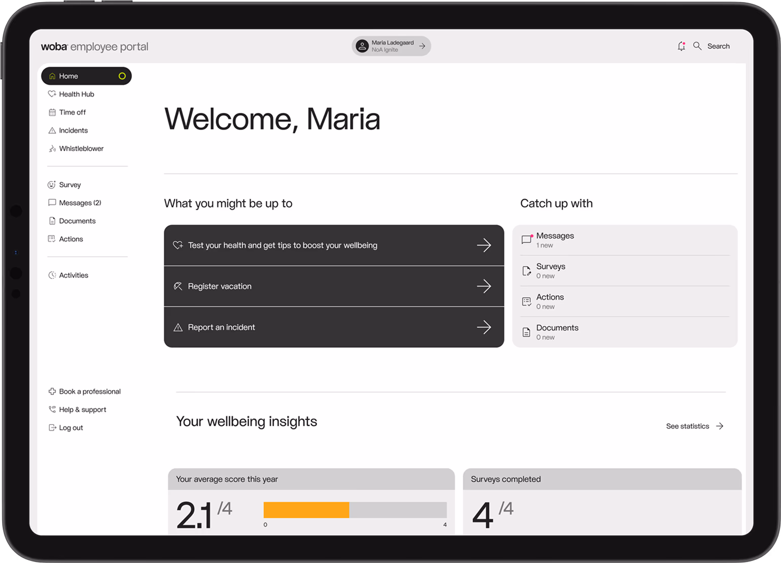 Woba er den første løsning, der kobler medarbejderdata fra trivselsmålingen direkte med forebyggende indhold og sundhedstilbud – alt samlet ét sted.
