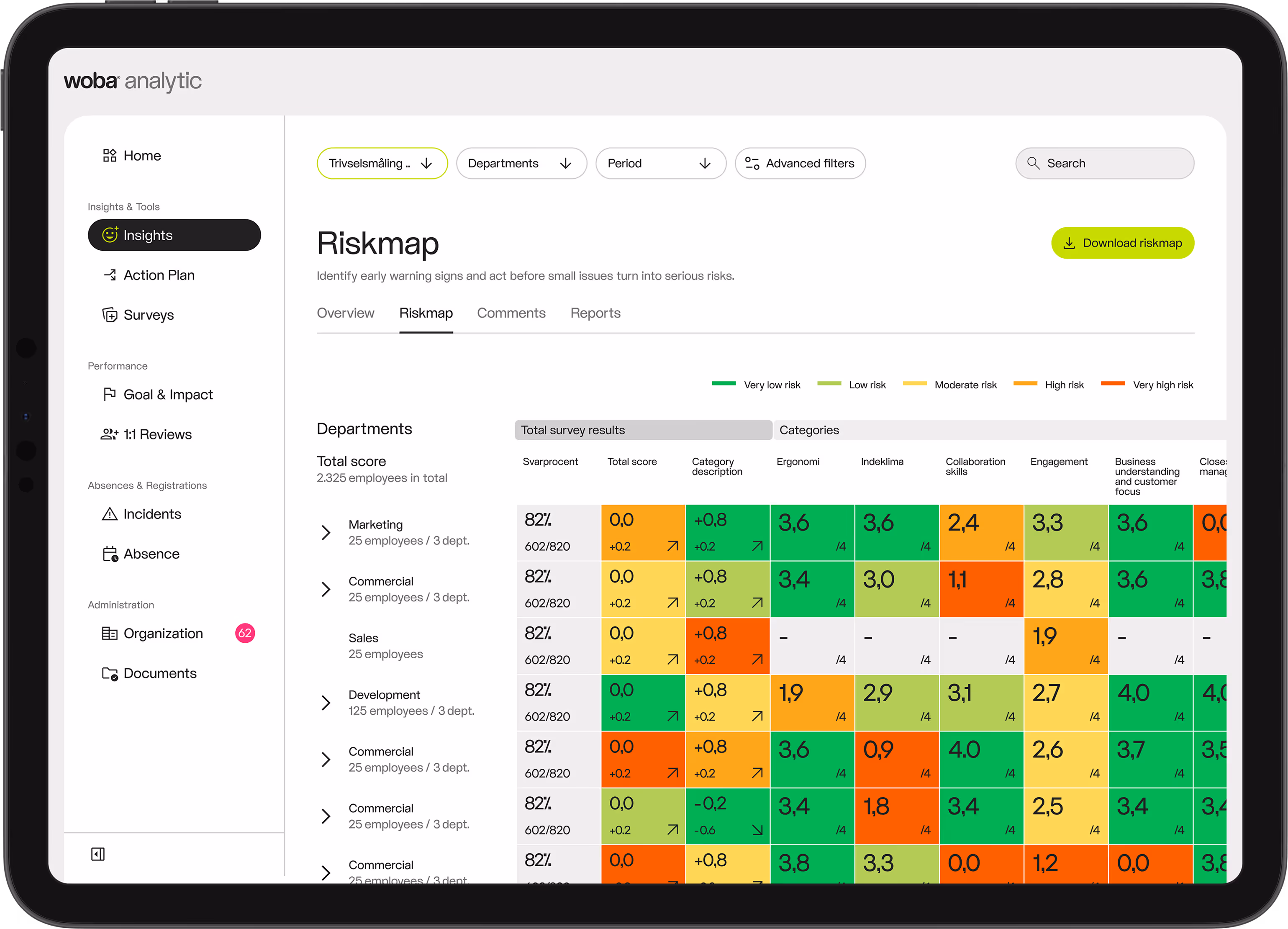 Saml HR og arbejdsmiljø i én fælles platform, hvor I får ét samlet datagrundlag til at forudsige risici, prioritere handlinger og skabe en koordineret proaktiv trivselsstrategi – på tværs af hele organisationen.