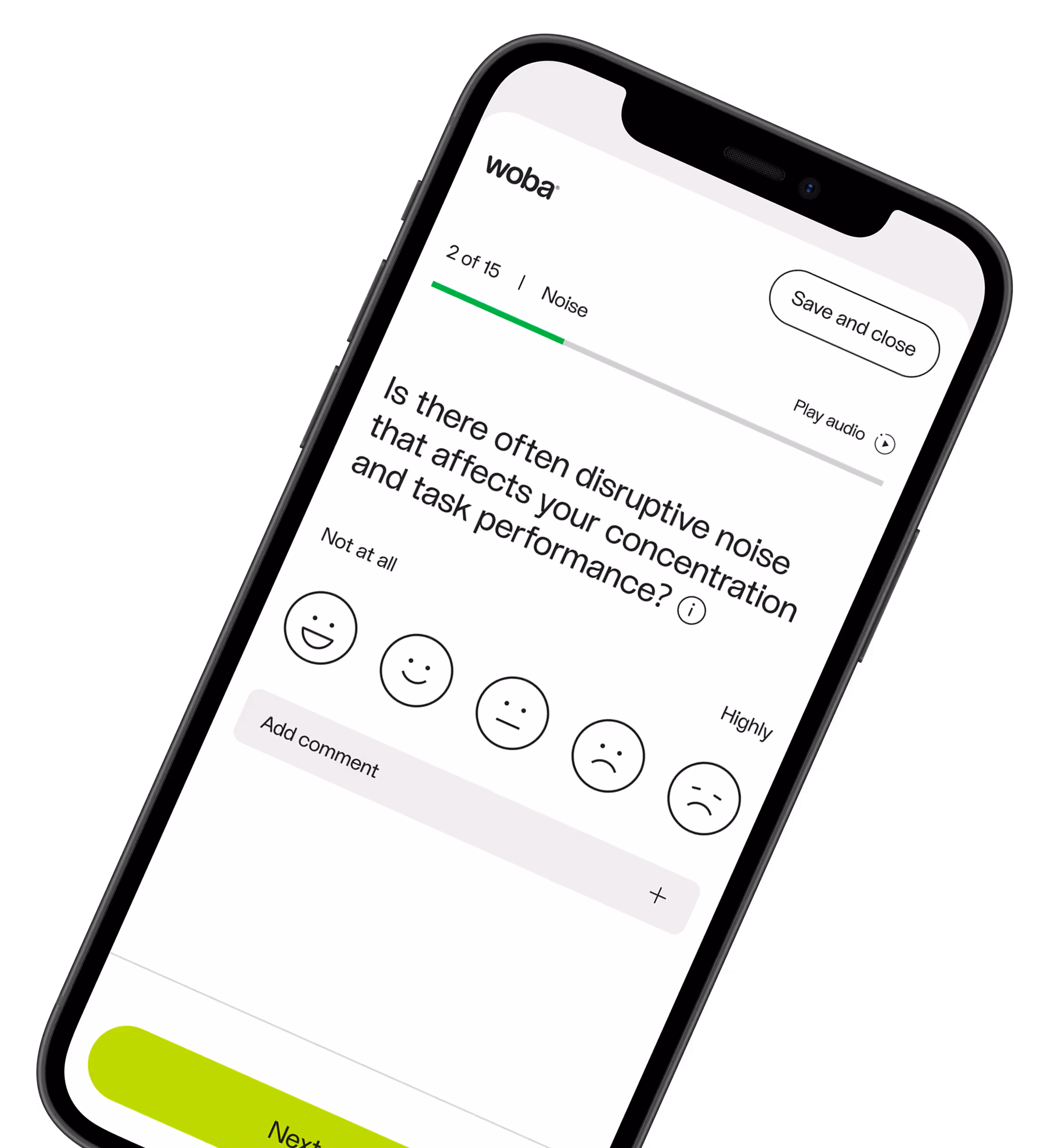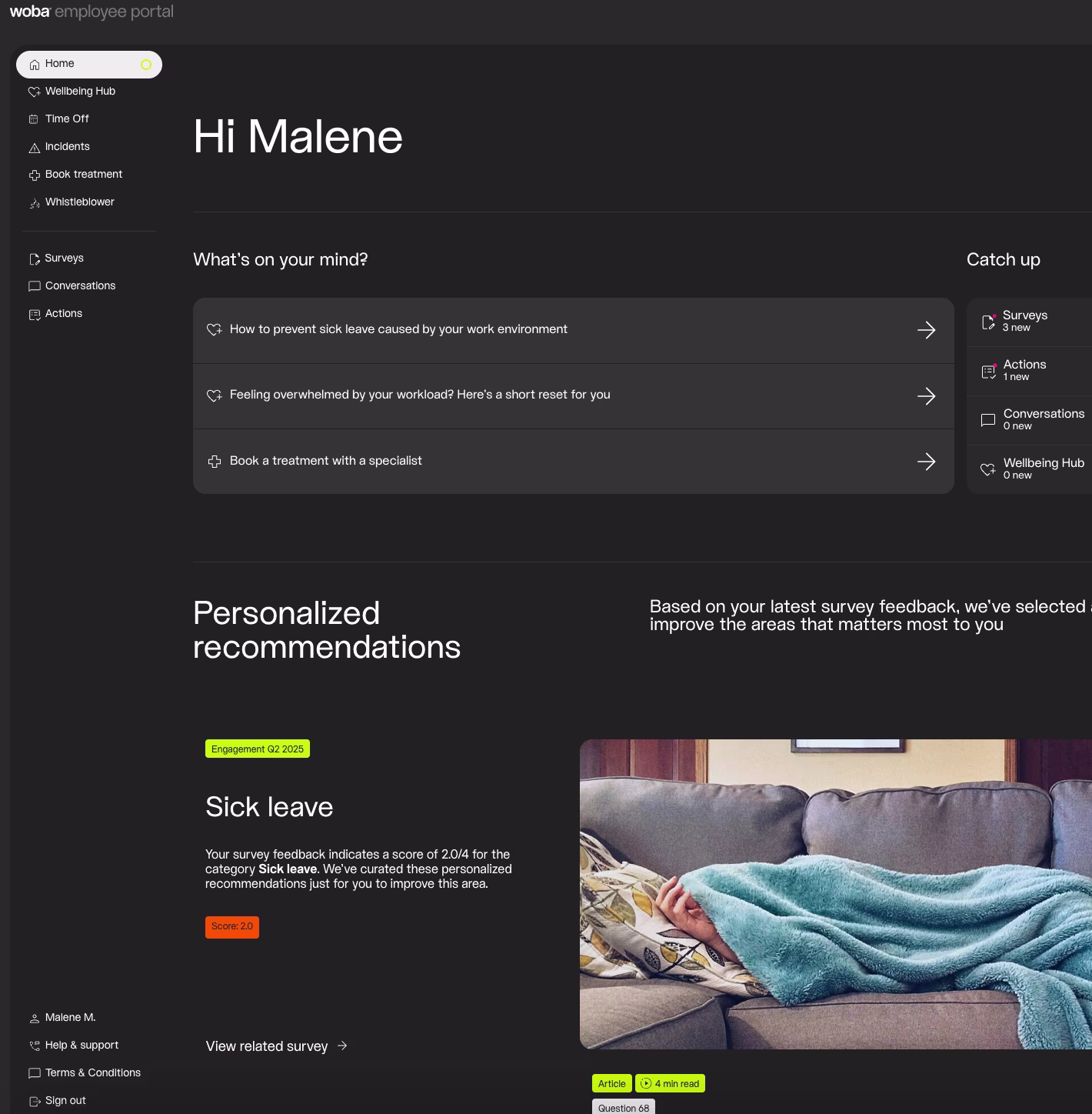 At Woba, we're the first to link real employee data from wellbeing surveys directly to personalized prevention. The result? Your team receives customized recommendations, targeted learning, and relevant content, along with treatments that fit their lives and address workplace risks.